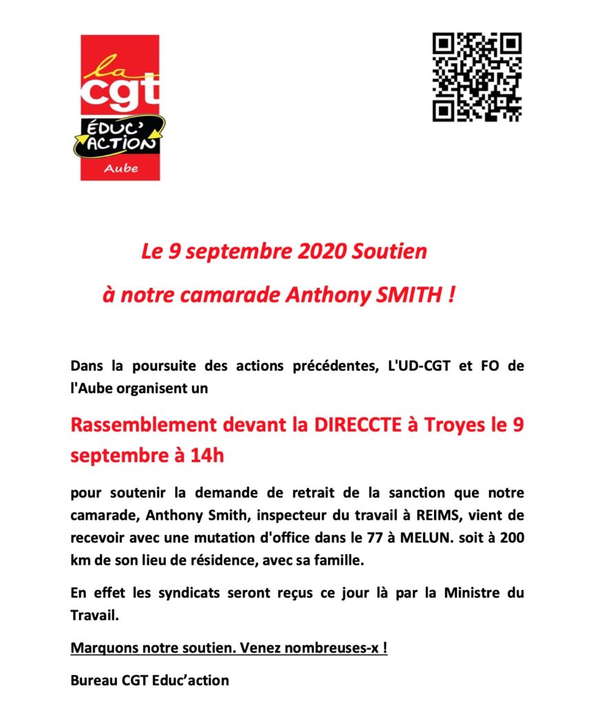 pour soutenir la demande de retrait de la sanction que notre camarade, Anthony Smith, inspecteur du travail à REIMS, vient de recevoir avec une mutation d’office dans le 77 à MELUN. soit à 200 km de son lieu de résidence, avec sa famille.