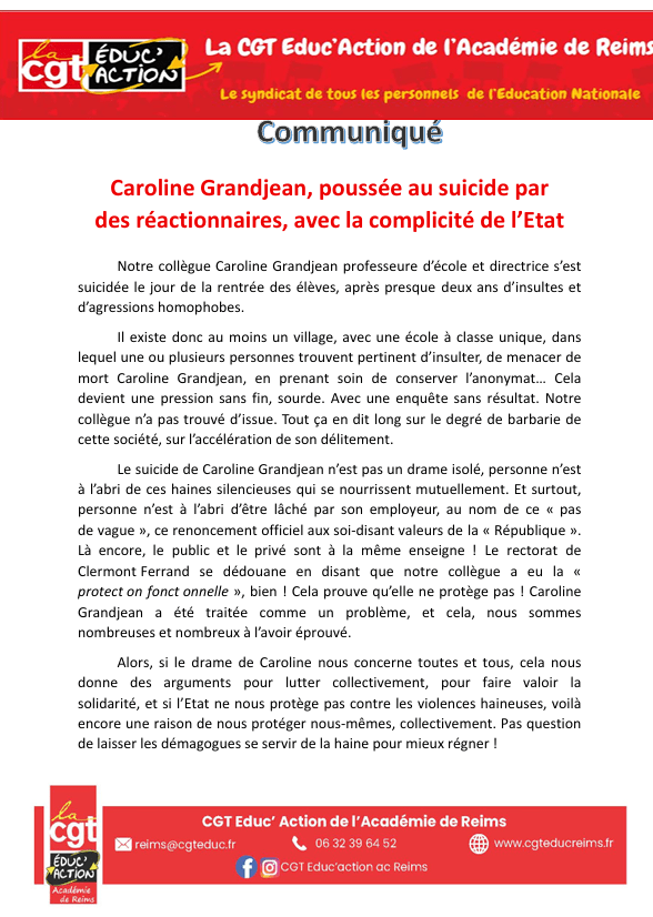 CAROLINE GRANDJEAN, POUSSEE AU SUICIDE PAR DES REACTIONNAIRES, AVEC LA COMPLICITE DE L’ETAT