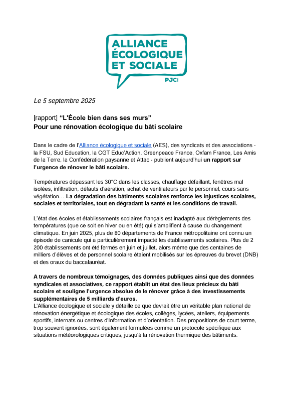 RAPPORT AES : POUR UNE RENOVATION ECOLOGIQUE DU BÂTI SCOLAIRE