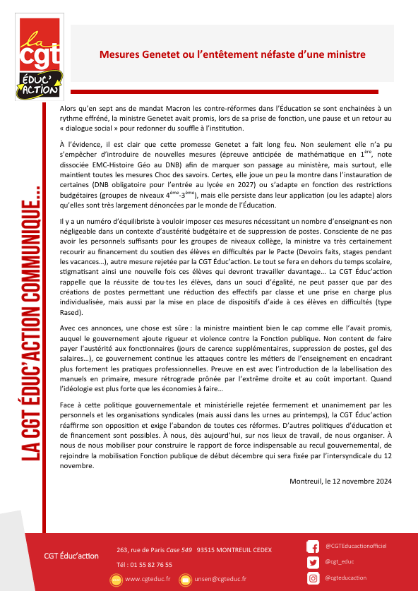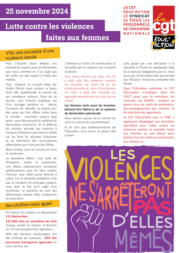 « […]Si la CGT Éduc’action s’est prononcée en faveur de ces nouveaux programmes, elle rappelle au ministère que pour être efficace, l’EVARS nécessite des moyens dédiés. Elle prend acte des annonces de la ministre sur la mise en place d’actions de formation à destination de l’ensemble des personnels et le soutien sans faille de l’administration à leur égard et saura, le cas échéant, la rappeler à ses engagements »
