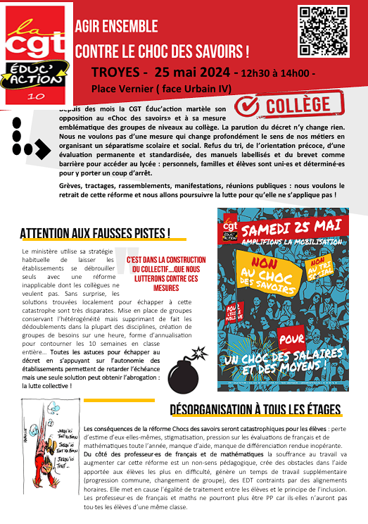 Nos organisations FSU, UNSA Education, CFDT Education, Formation, Recherche Publiques, CGT Educ’Action et SUD Education travaillent également à construire une rentrée offensive et appellent les personnels à rester mobilisés : le « choc des savoirs » ne doit pas s’appliquer !